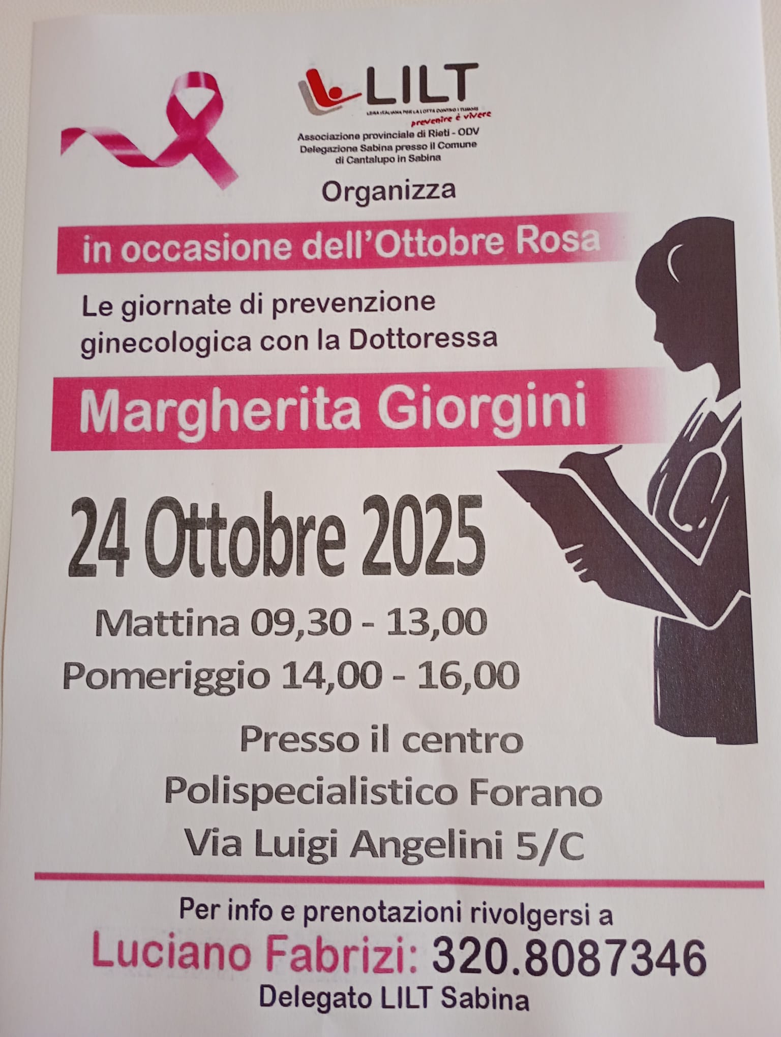 E' prevista per venerdì 24 ottobre dalle ore 9,30 alle ore 13 e dalle ore 14 alle ore 16 presso il Poliambulatorio Specialistico di Arnaldo Cianfa in Forano (RI) la VISITA SPECIALISTCA GINECOLOGICA con la dott.ssa Margherita Giorgini.. La visita è gratuita per i soci provvisti di tessera Lilt.
